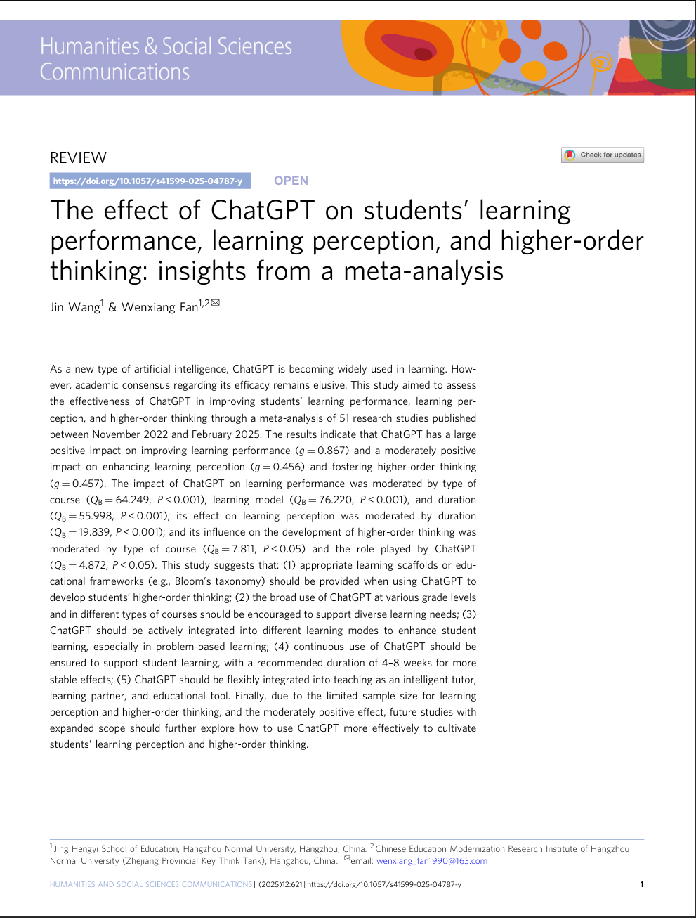 Jin Wang & Wenxiang Fan — The effect of ChatGPT on students’ learning performance, learning perception, and higher-order thinking: insights from a meta-analysis